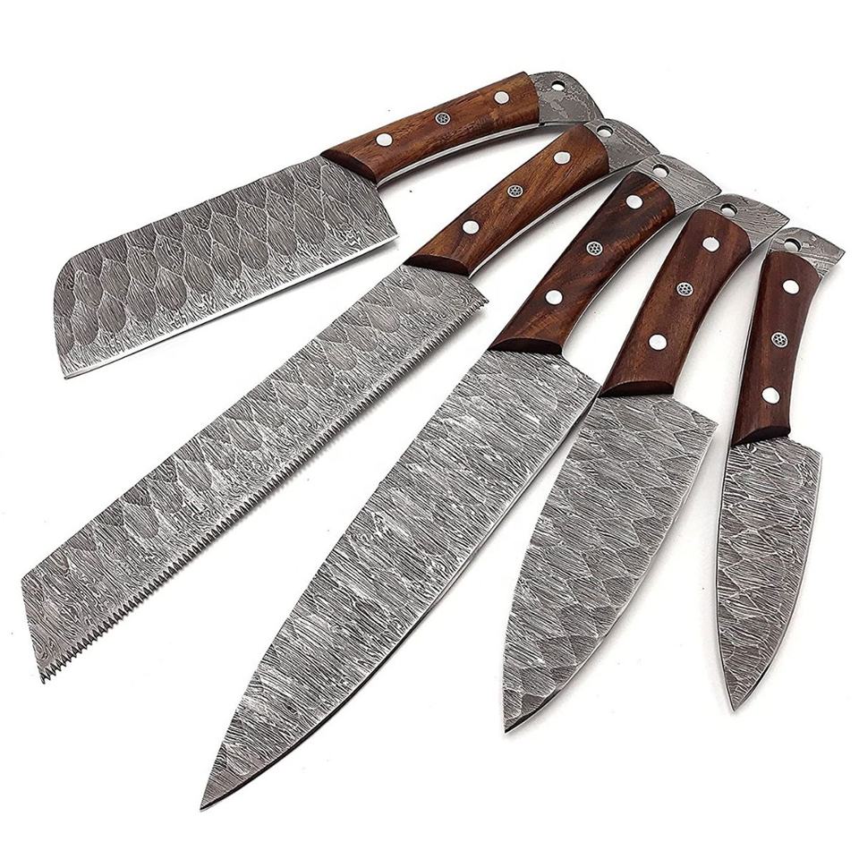 Juego de Cuchillos de Cocina de Acero de Damasco Hechos a Mano de Primera Calidad, 5 Piezas, Mango de Madera de Nogal con Funda de Cuero