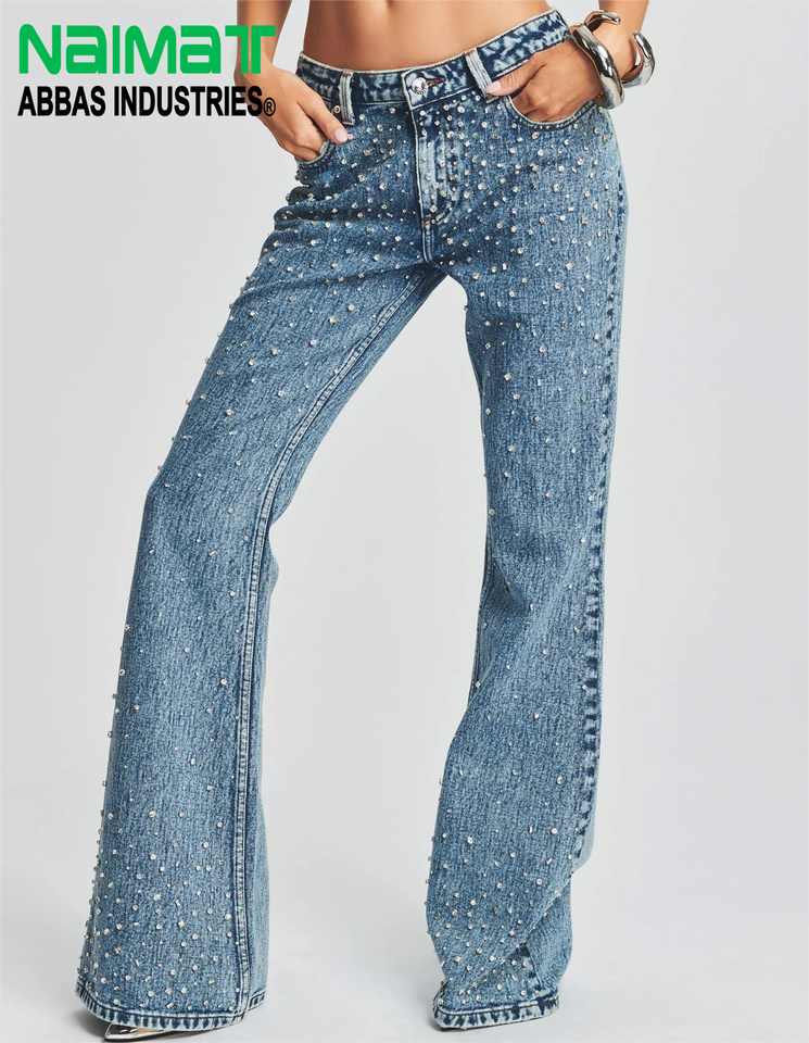 Vaqueros acampanados de tiro alto con pedrería premium para mujer, pantalones de pierna ancha con cristales para fiestas y eventos nocturnos