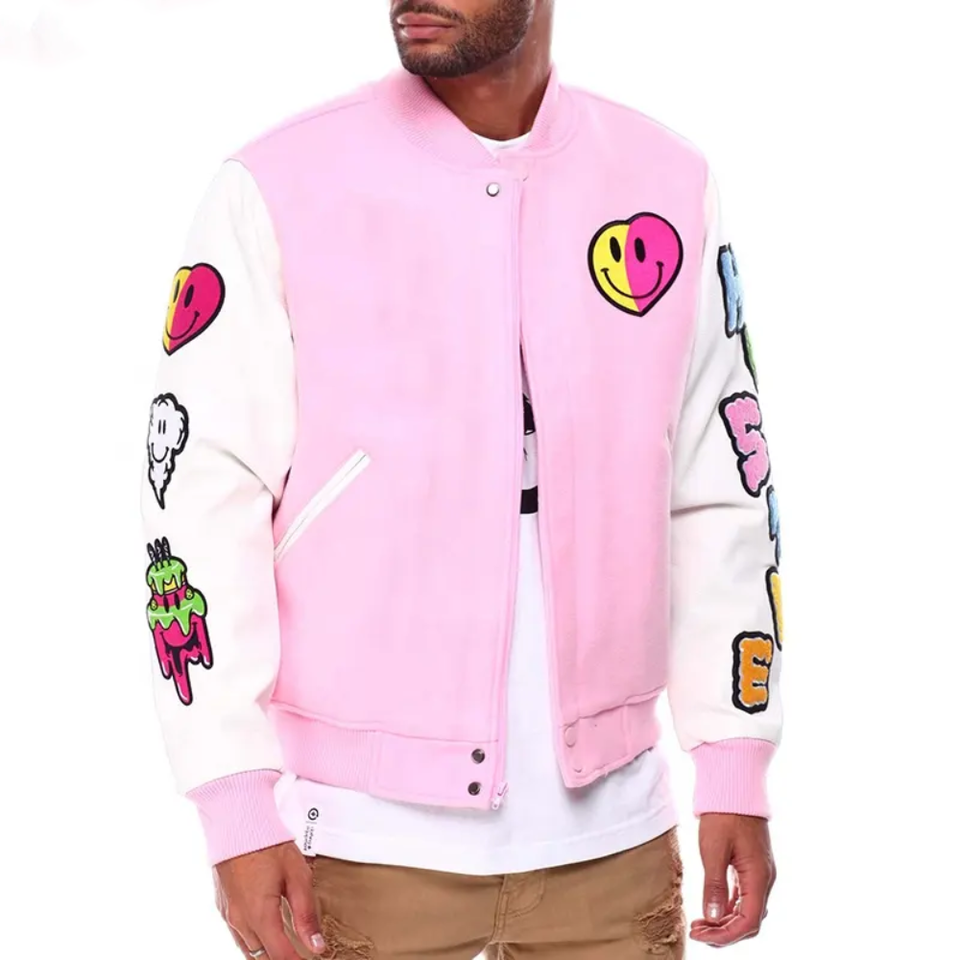 Chaqueta universitaria con parches de chenilla para hombre con botones y manga de cuero de lana de primera calidad