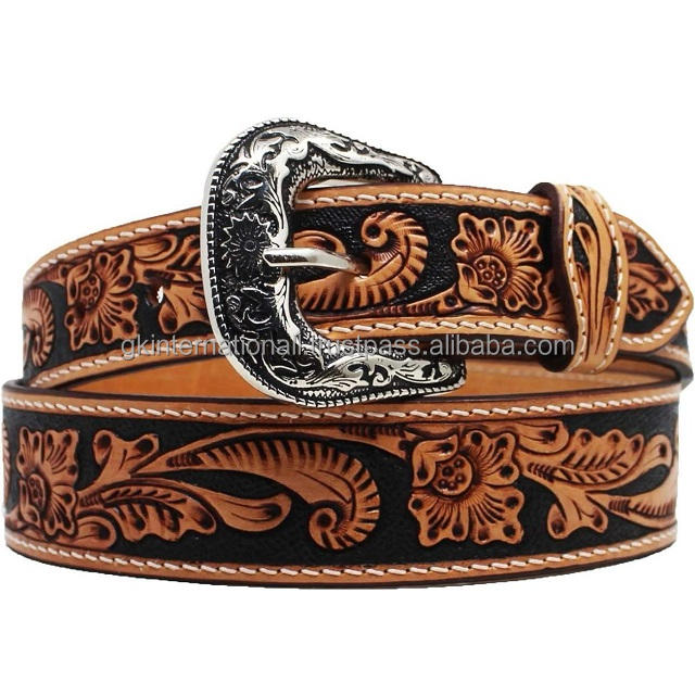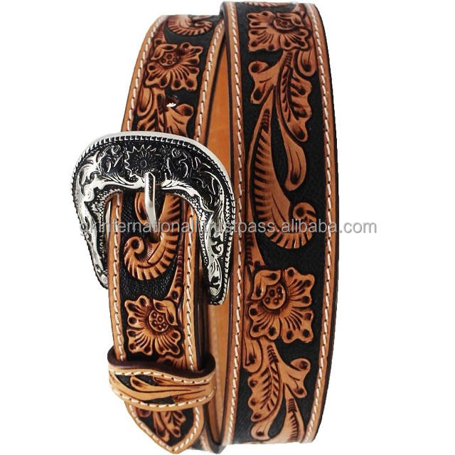 Cinturón de cuero occidental genuino para hombre hecho a medida en relieve con diseño de hoja Premium con hebilla de pasador de latón antiguo de diseñador