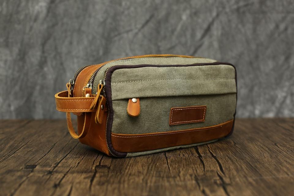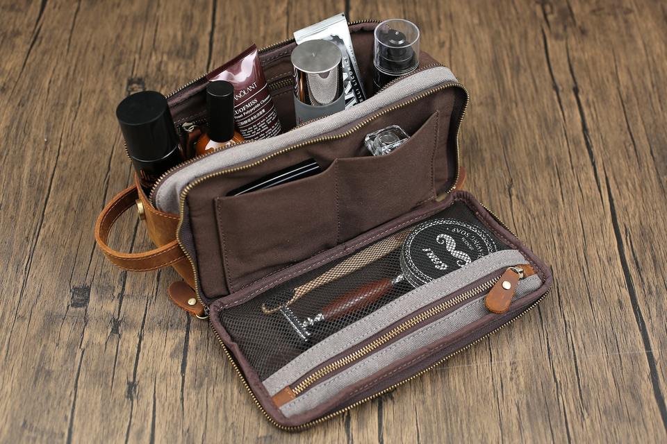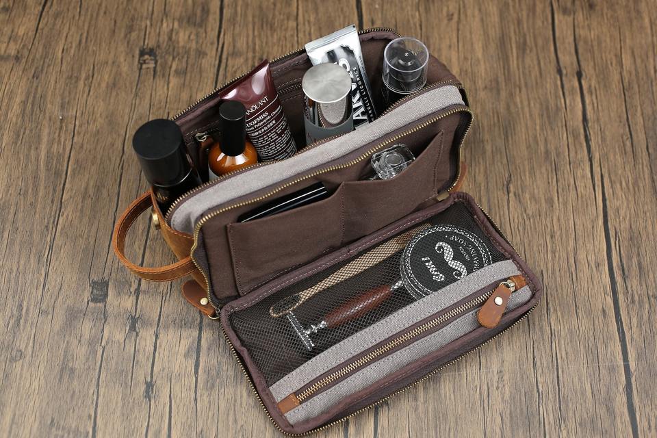 Neceser de lona de cuero de primera calidad para hombres, Kit Dopp de viaje, estuche de lavado, organizador de cosméticos de afeitar,