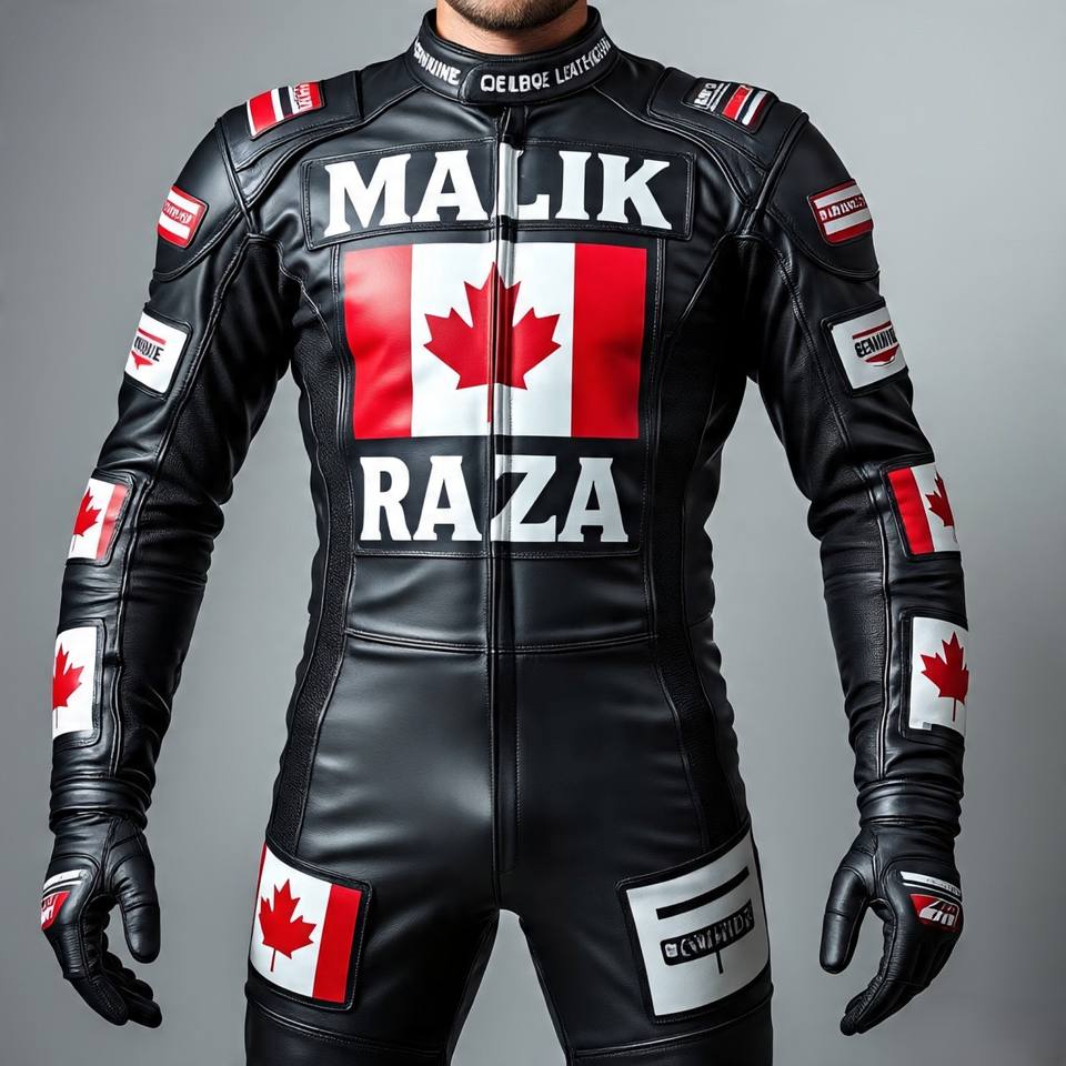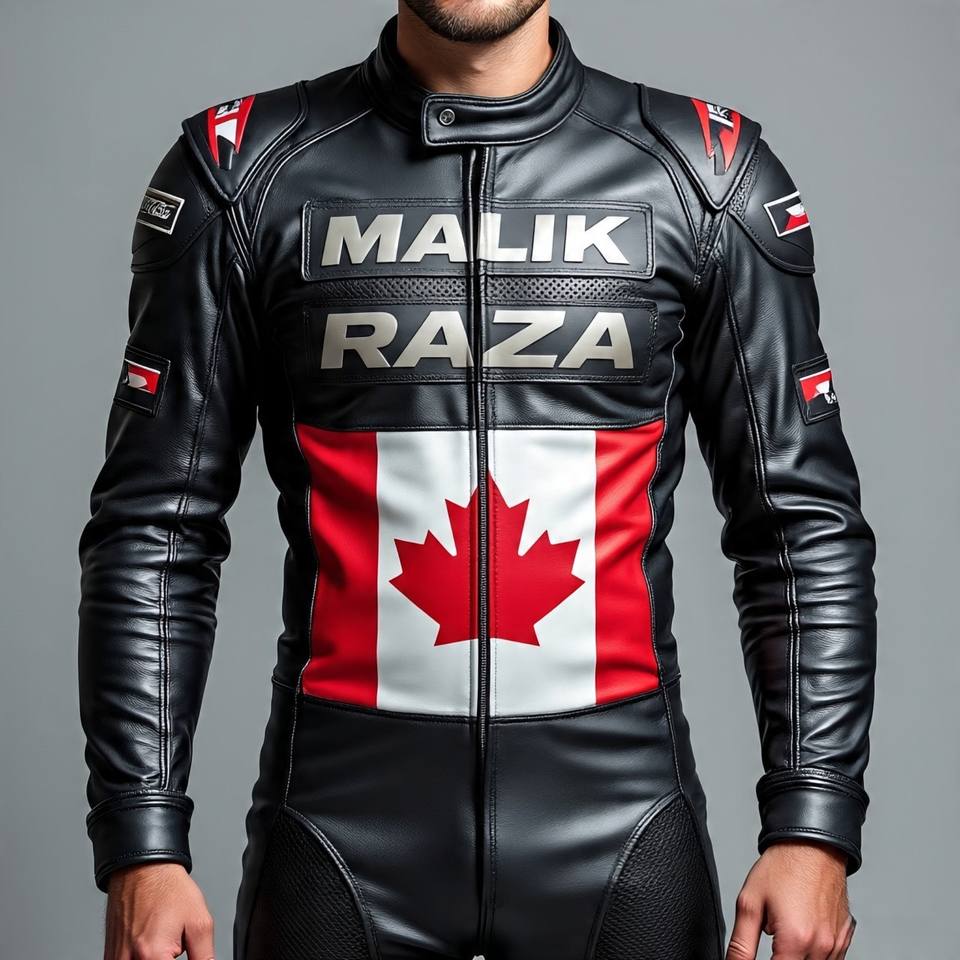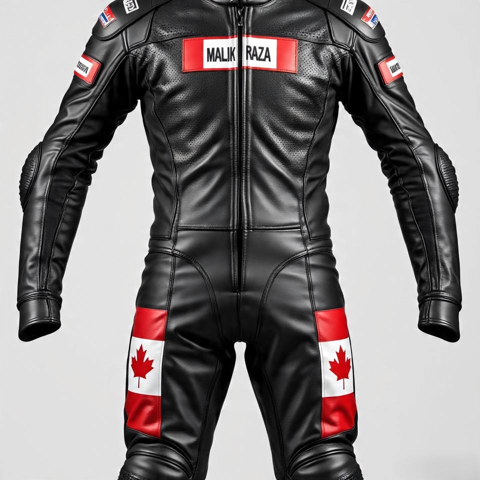 Traje de motocicleta de cuero Premium con diseño vibrante de hoja de arce de la bandera de Canadá, construcción de cuero de vaca duradera y ajuste deportivo