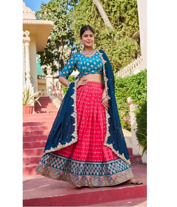 El paquete contiene:Lehenga, Blusa, Dupatta, Cordón con Cremallera