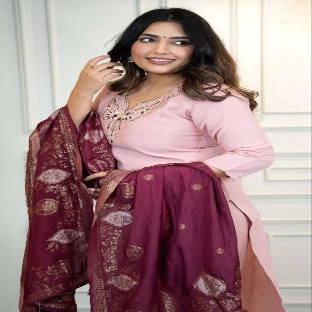 Conjunto Premium de Kurti, Pantalón y Dupatta de Seda Romana Rosa Claro para Mujer, Diseño Artesanal con Dupatta de Jacquard de Nailon y Muselina, Ropa Festiva