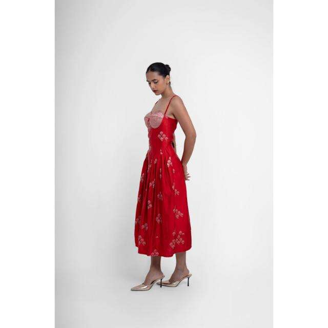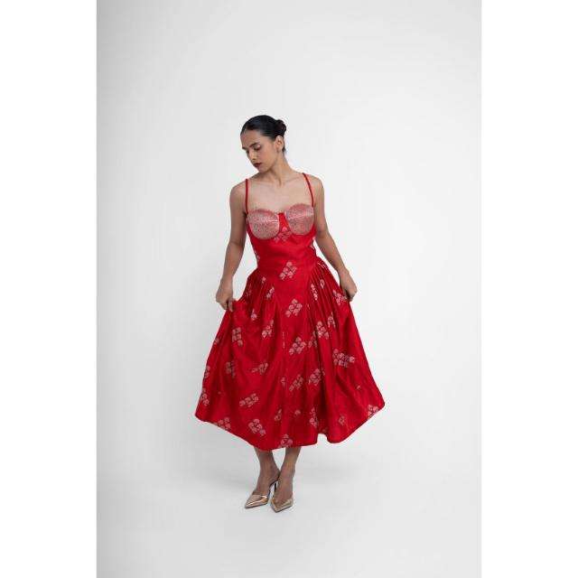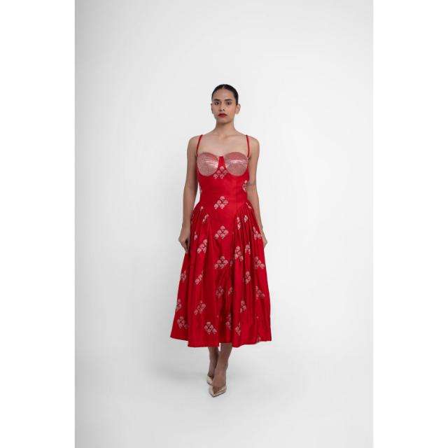 Vestido Rojo Rene de Longitud al Tobillo con Aspecto Premium, Motivos Tejidos Intrincados, Cuerpo Estructurado y Silueta Elegante