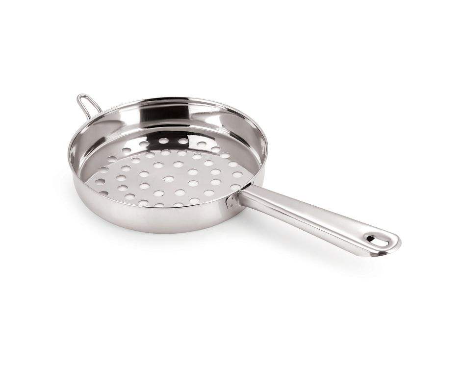 Sartén Premium Multiusos de Acero Inoxidable de 18 cm con Acabado Cromado Pulido Espejo, Mango Largo, Perforada para Vapor y Freír, en Existencia