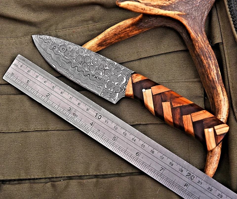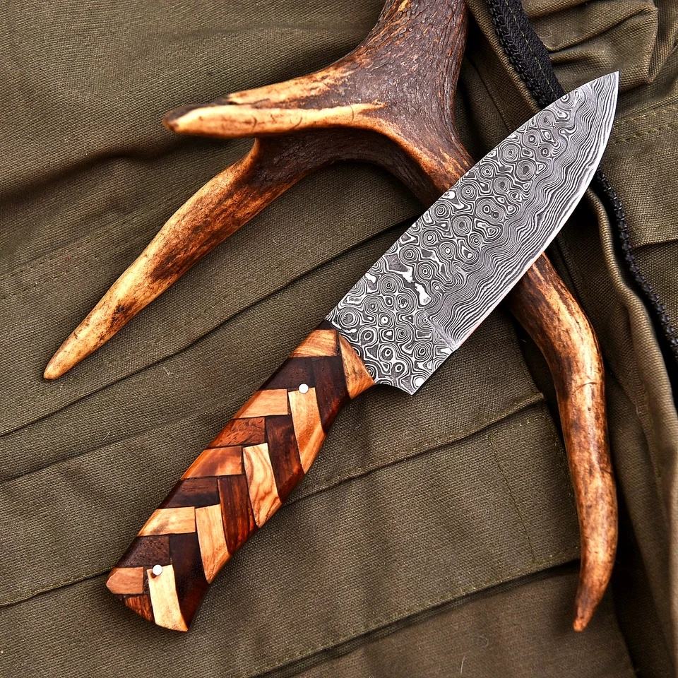 Cuchillo de caza y camping premium multifuncional de hoja recta de Damasco con punta caída, patrón de mosaico y mango de madera segmentado, personalizado.