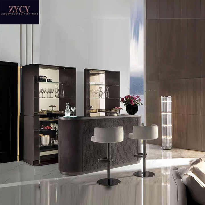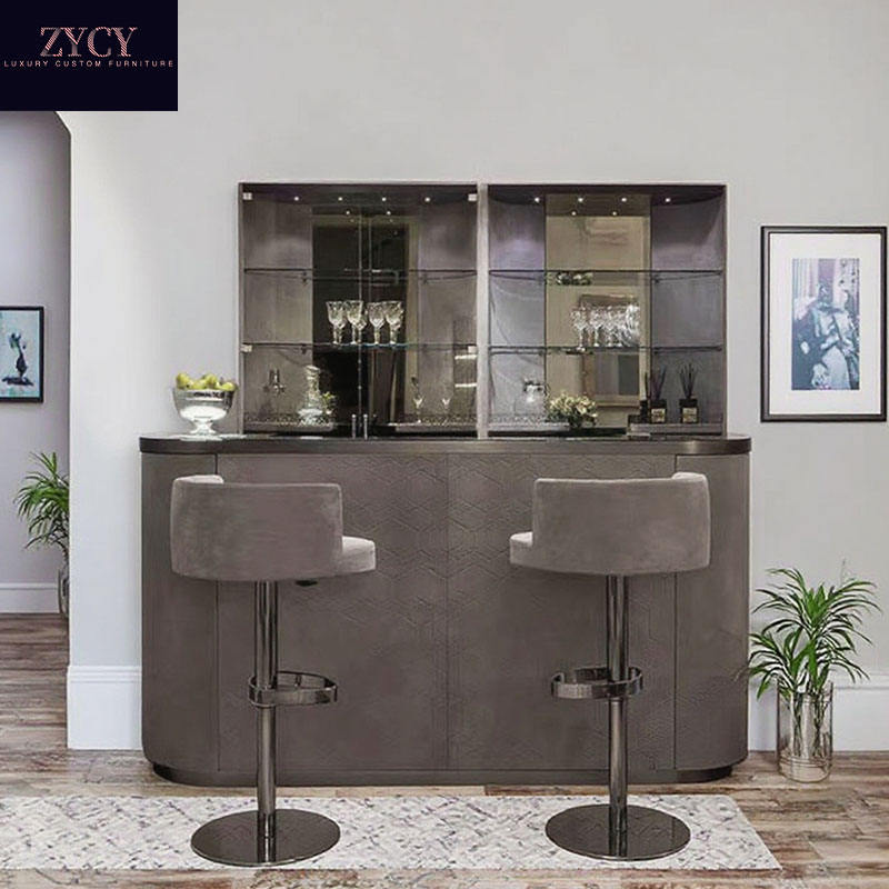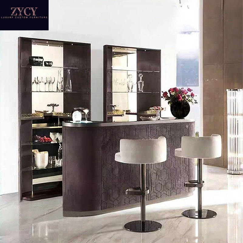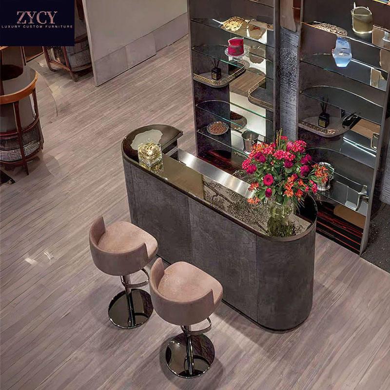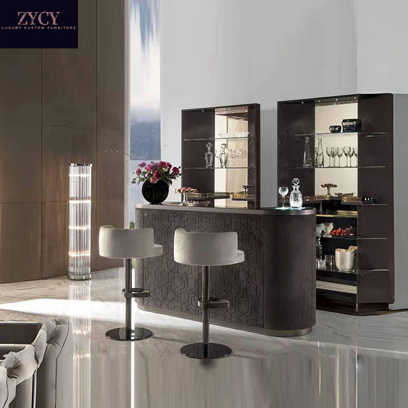 Juego de bar de vinos con espalda abierta de primera calidad, mesa de madera maciza, fregadero integrado, nevera, taburetes giratorios de terciopelo de acero inoxidable, armario con espejo, comedor