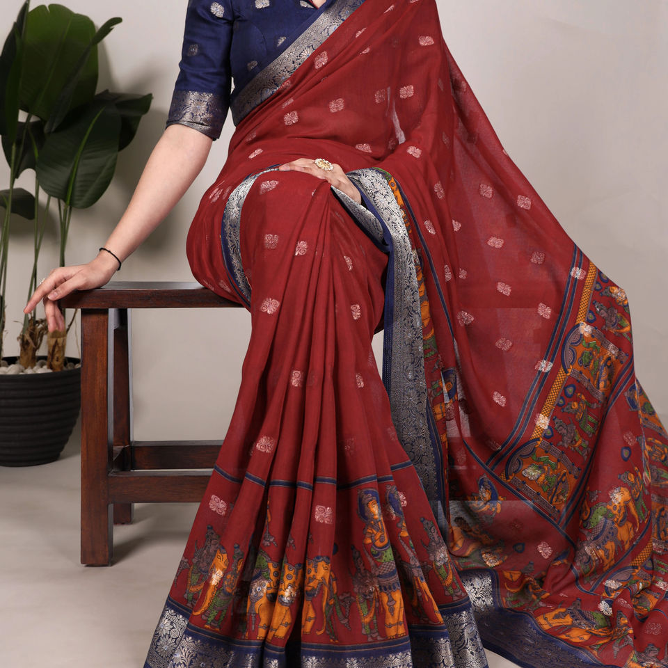 Trabajo de Sari:Impresión de Kalamkari con Zari que teje la frontera del trabajo