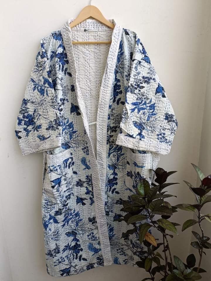 Bata Kimono de Algodón 100% de Primera Calidad, Color Azul, Hecha a Mano en India, para Mujer