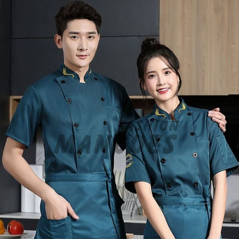 Chaqueta de Chef Azul de Manga Corta de Primera Calidad, Personalizada, Uniforme de Restaurante para Hombre, Diseño Cruzado, Lona 100%