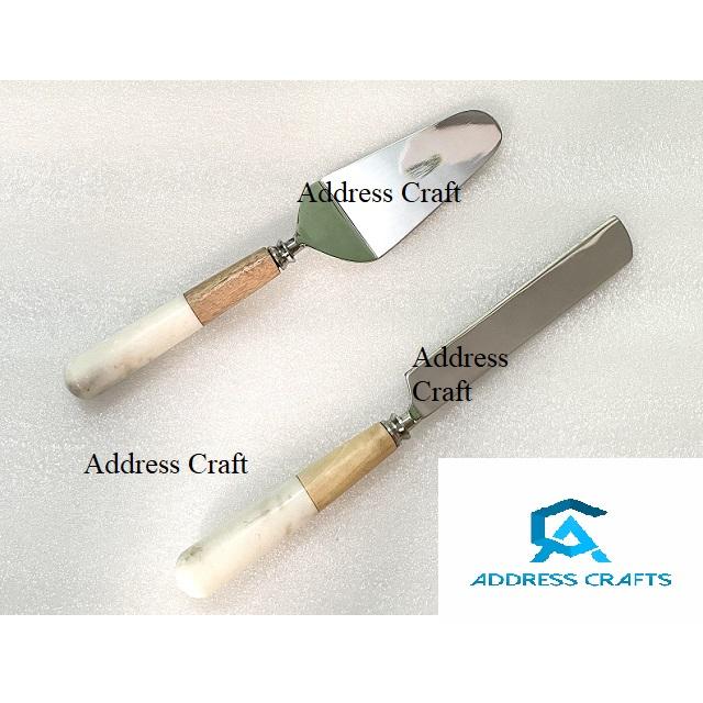 Juego de servidor de pastel de calidad superior Juego de acero inoxidable con mango de mármol y madera Cuchillo para pastel Vajilla Juego de servidor de pastel de cumpleaños