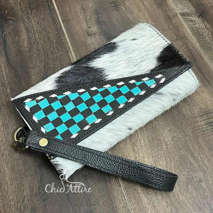 Cartera de cuero genuino con diseño a cuadros y trabajada a mano