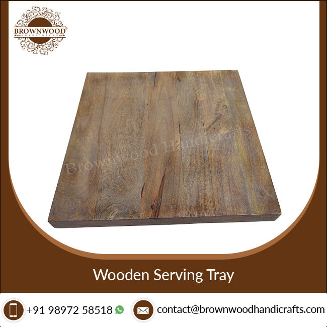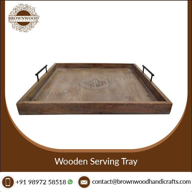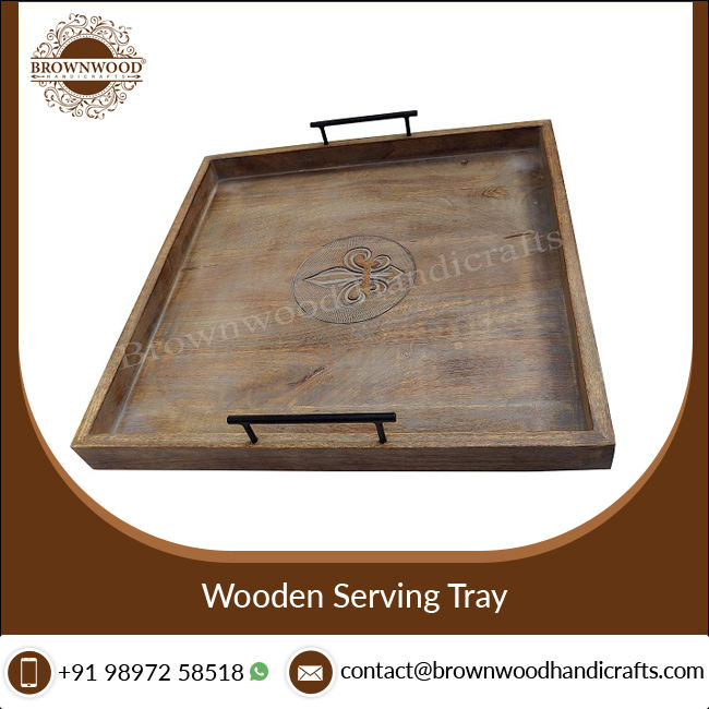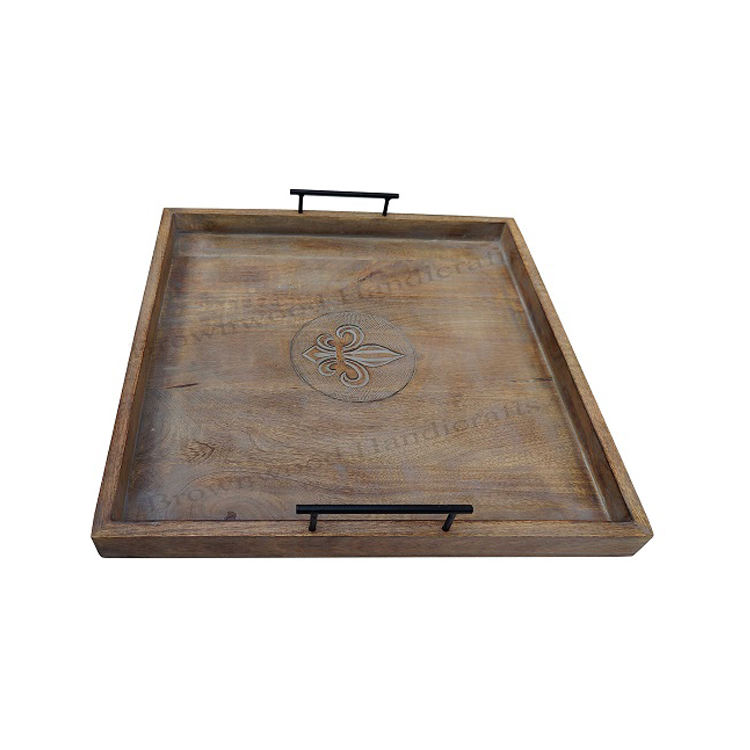 Bandeja grande de forma cuadrada de madera de mango de calidad superior, bandeja de madera tallada de diseño personalizado con asas de metal para restaurantes y hoteles