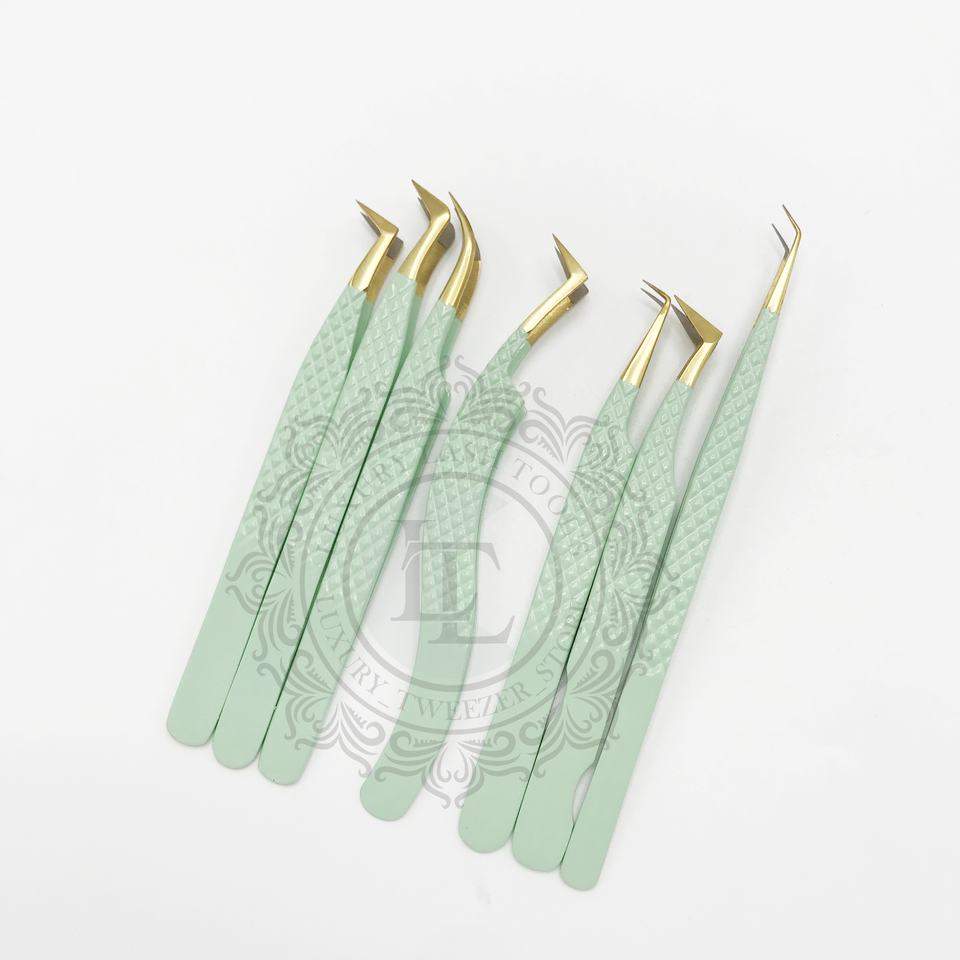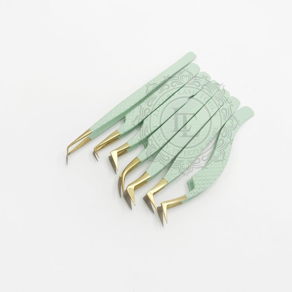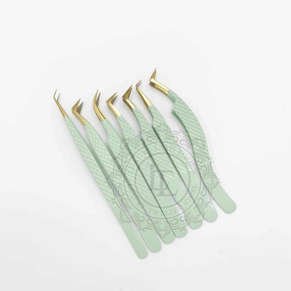Pinzas de pestañas de volumen de acero inoxidable profesional de nuevo diseño, agarre de diamante, revestimiento de polvo Verde menta, punto de oro sostenible