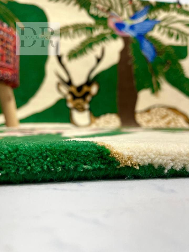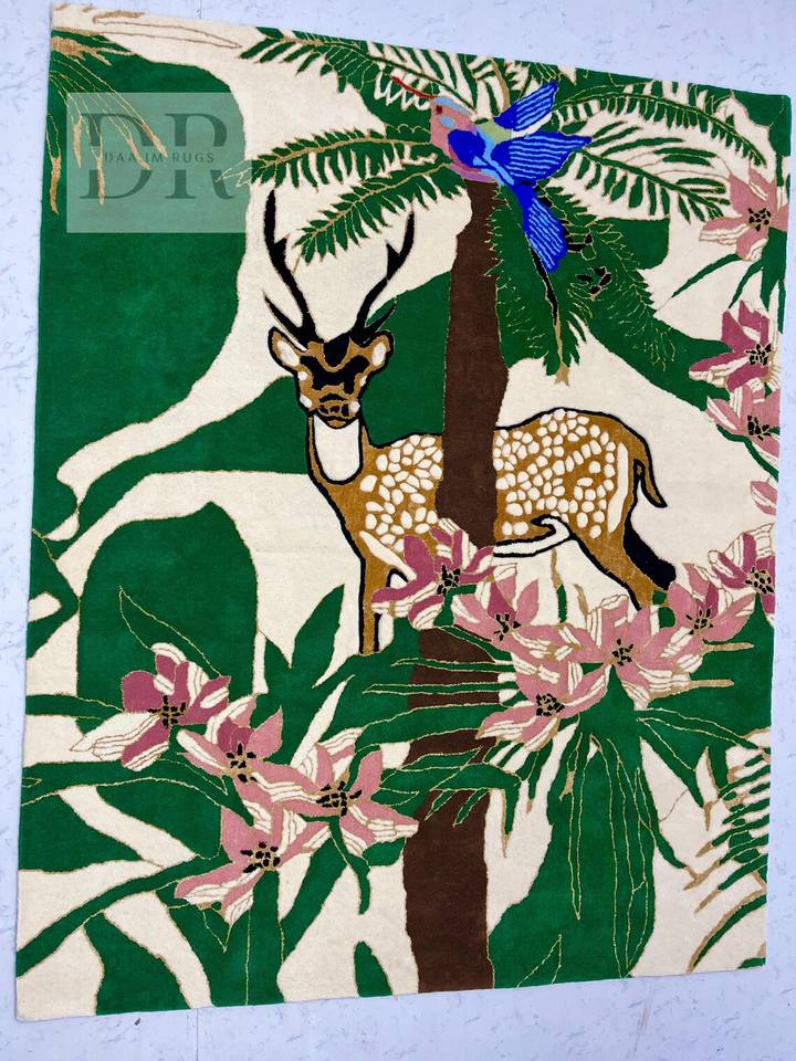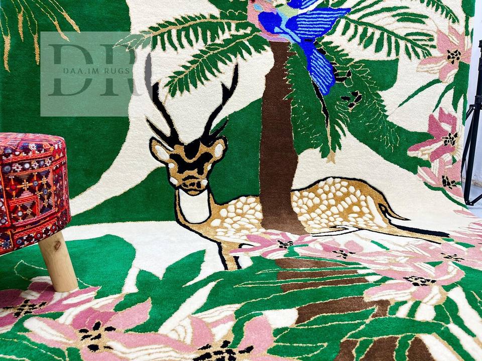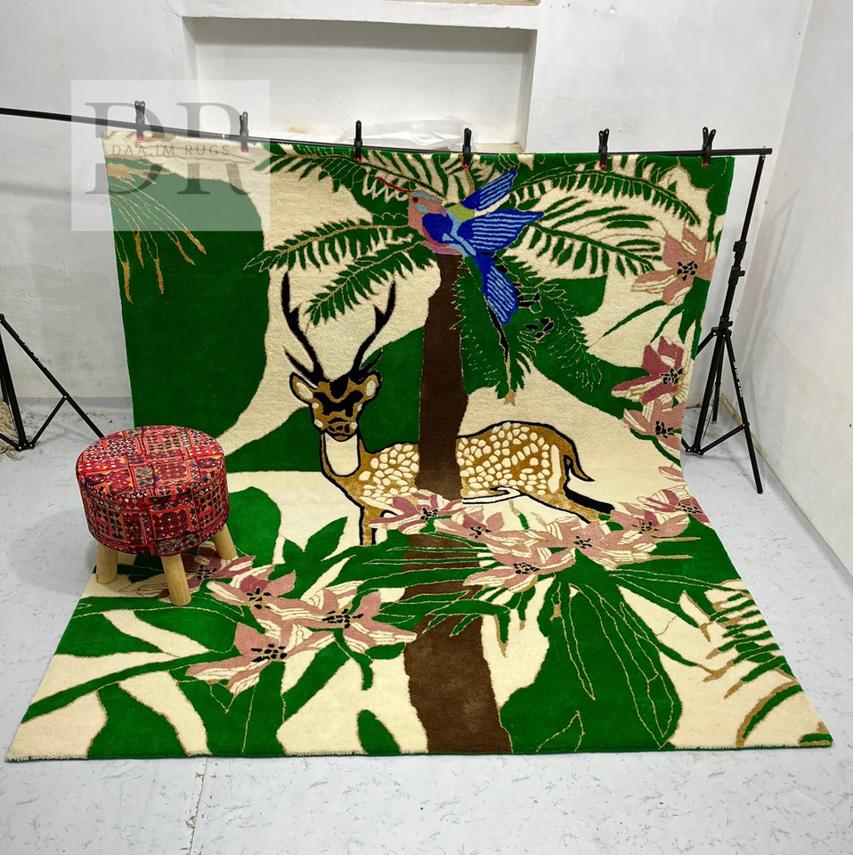 Alfombra de Lana Tejida a Mano de Diseño Moderno con Motivos de Reno y Selva Floral, Antideslizante, Lavable y Personalizable para el Hogar