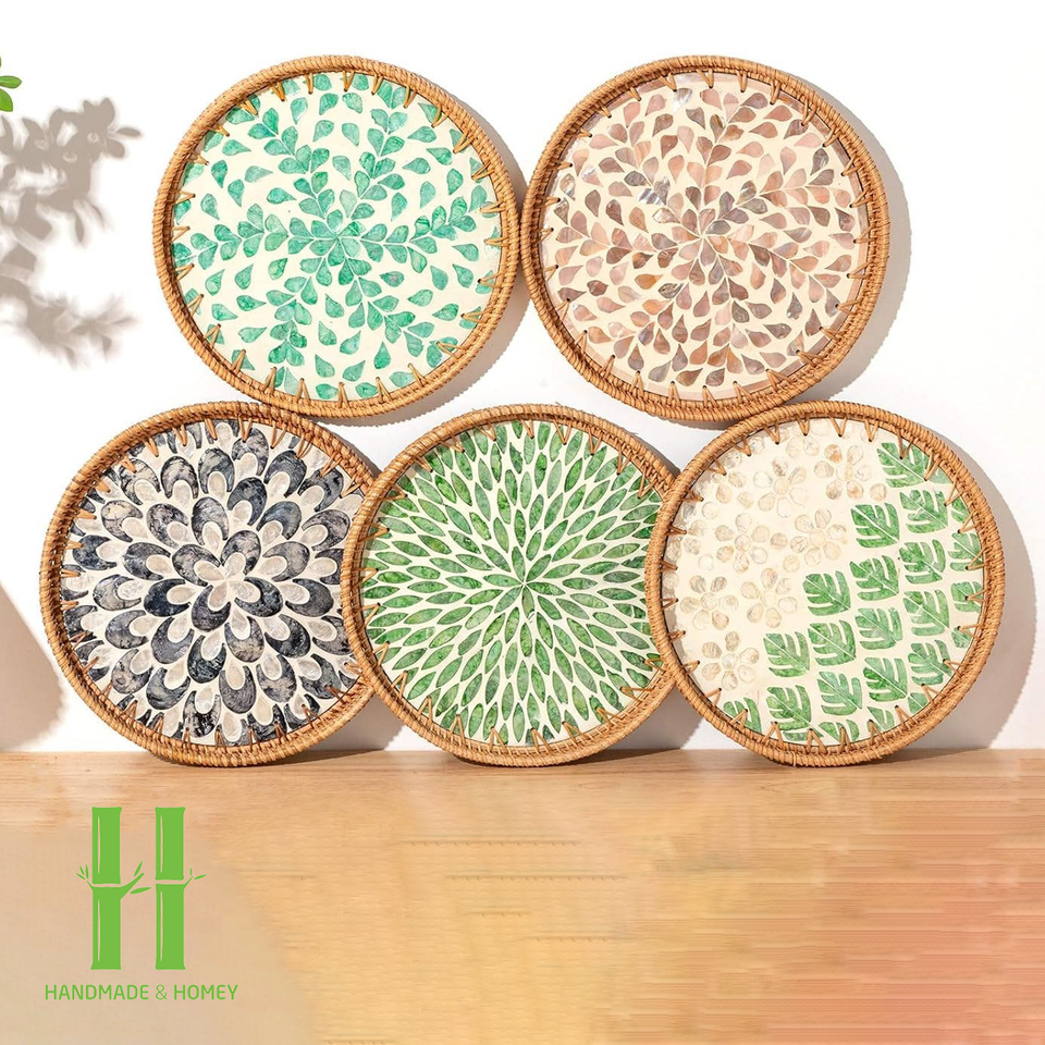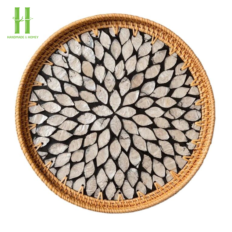 Bandeja para servir decorativa redonda de estilo bohemio de bambú de primera calidad con base de madera y mango de inserción para servir frutas