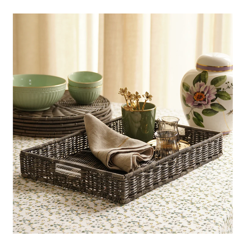 Bandeja Rectangular de Ratán de Primera Calidad, Tejida a Mano, con Asas de Madera, Ecológica, para Servir Té y Café en la Cocina