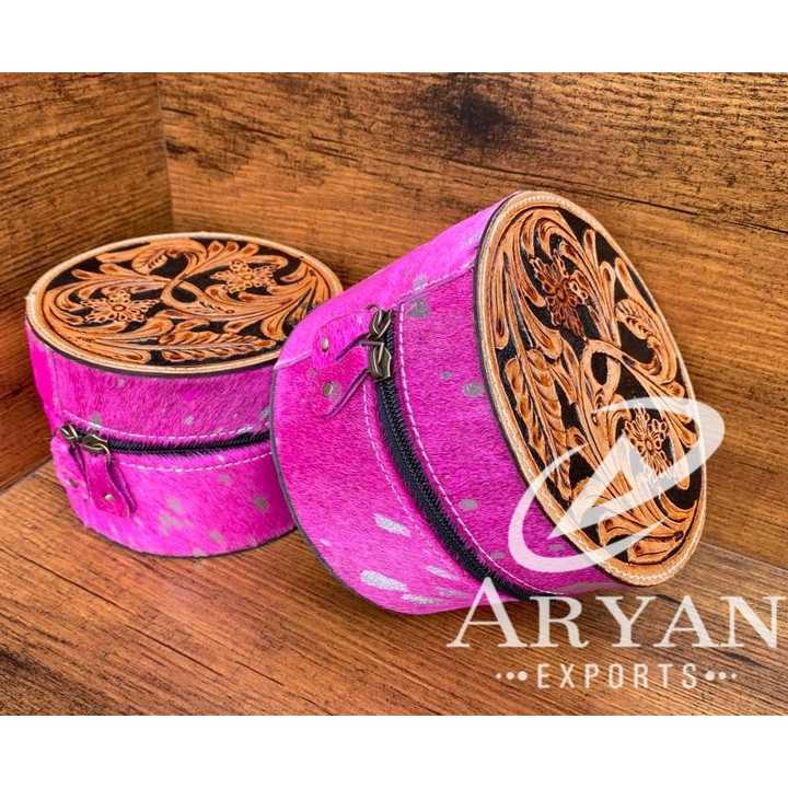 Nombre del producto:Caja de joyería redonda de piel de vaca mecanizada a mano