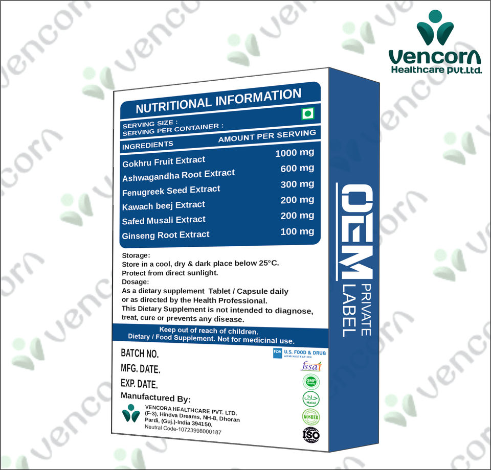 Ingrediente principal:EXTRACTO DE FRUTA DE GOKHRU, EXTRACTO DE RAÍZ DE ASHWAGANDHA, Extracto de semilla de fenogreco, Extracto de Semilla de Kawach, Extracto de muesli seguro, extracto de raíz de ginseng