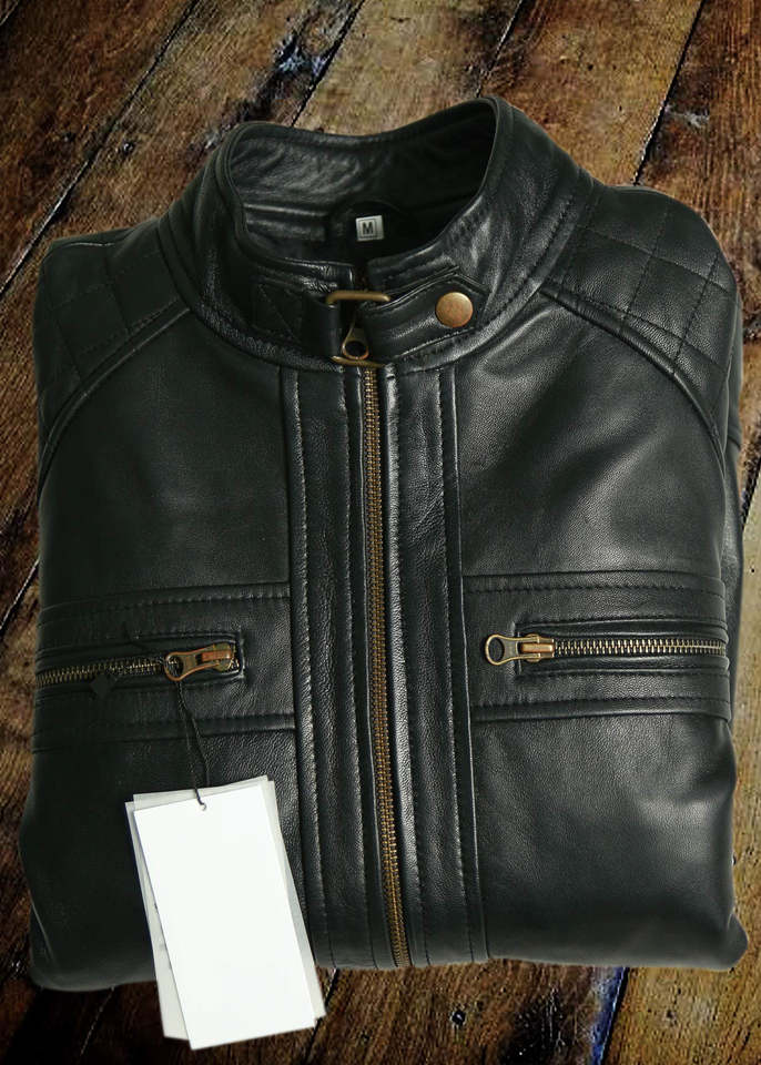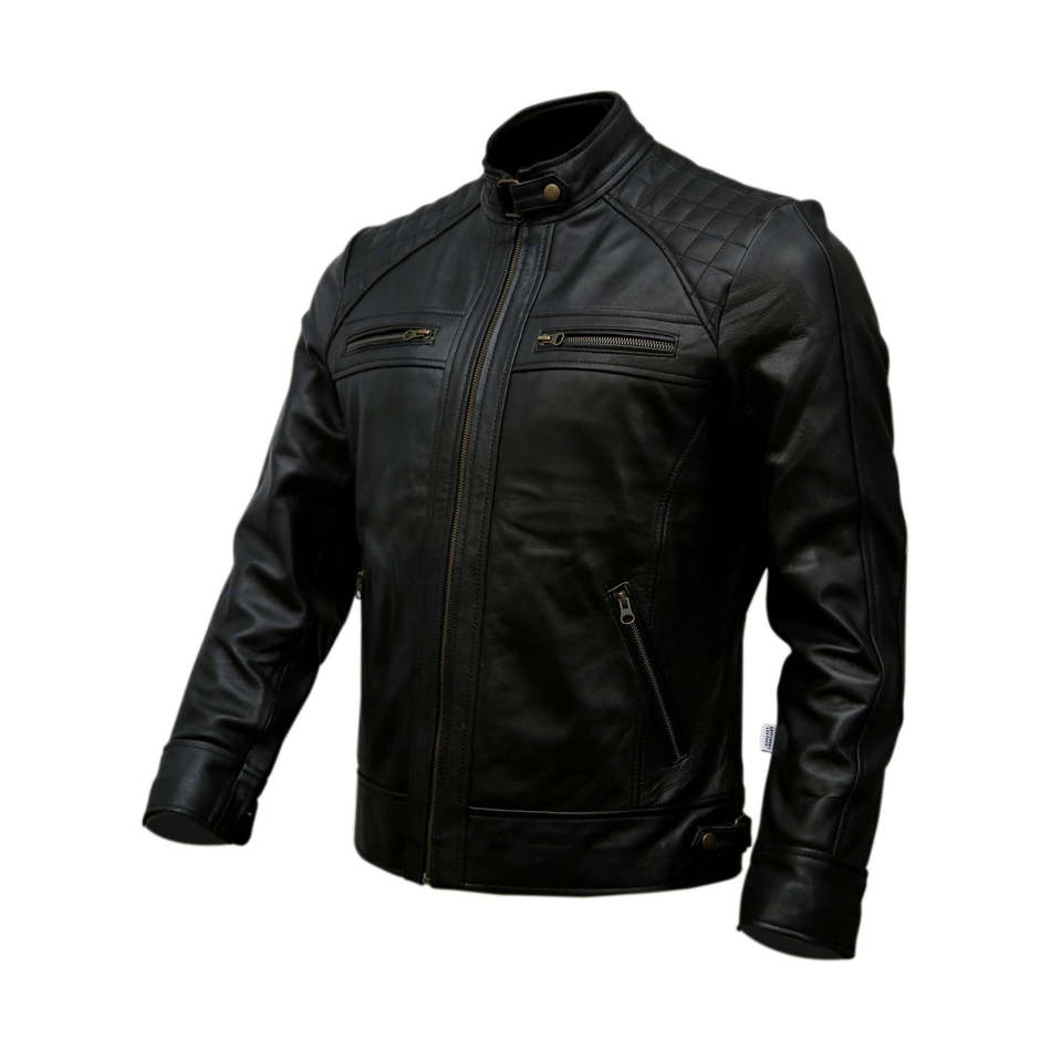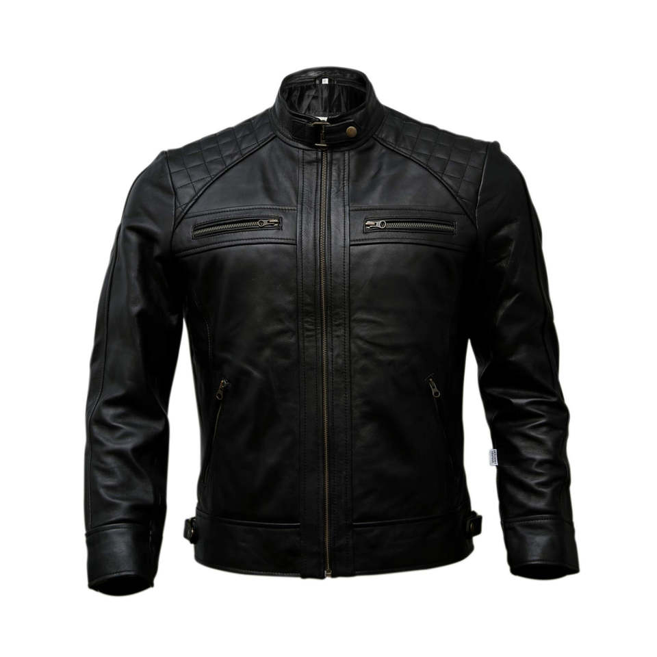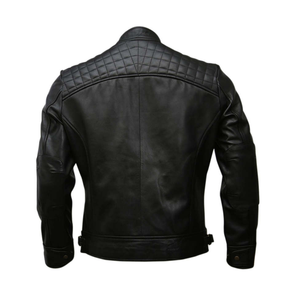 Chaqueta de cuero estilo Cafe Racer para hombre, corte ajustado, con acolchado de diamantes en los hombros, cuello mandarín y cierre de cremallera.
