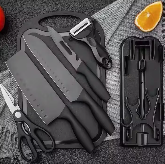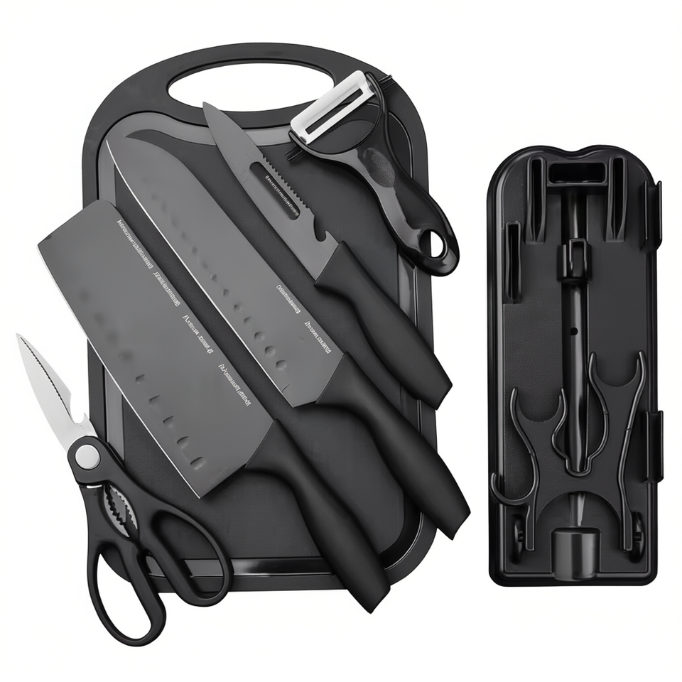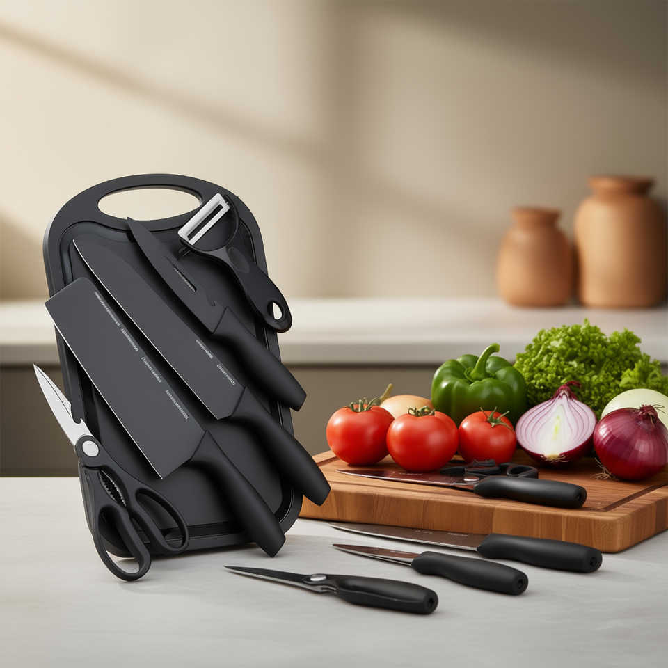 Juego de Cuchillos de Cocina de Acero Inoxidable Premium de 7 Piezas, Cuchillos de Bloque, Tijeras Negras, Mangos de Plástico ABS, Hoja Recta Pulida