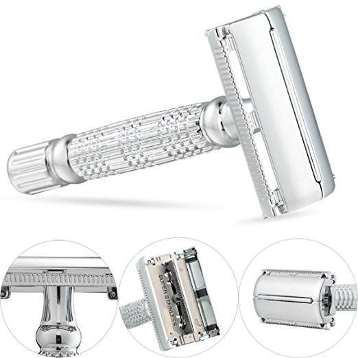 Maquinilla de Afeitar de Seguridad Premium de Acero Inoxidable para Hombre, Maquinilla de Afeitar Clásica de Doble Filo con Mango Ergonómico para Afeitar Cara/Cuerpo/Bikini Kaamir