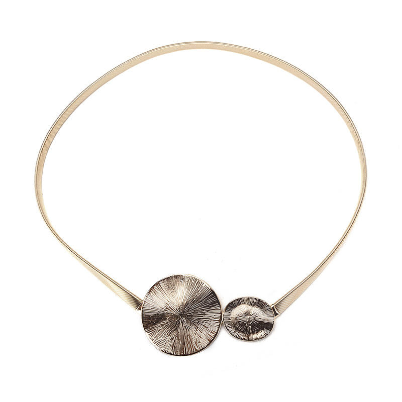 Cinturón de metal dorado con cuentas para mujer de primera calidad, tamaño elástico, ajuste, hebilla de disco redondo, decoración de abrigo