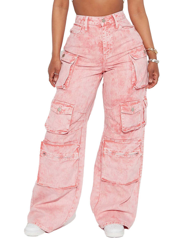 Pantalones Cargo de Mezclilla Premium para Mujer, de Talle Alto, Lavado Ácido Rosa, Pierna Ancha, Multibolsillos, Ajuste Holgado, Estilo Utilitario de Algodón