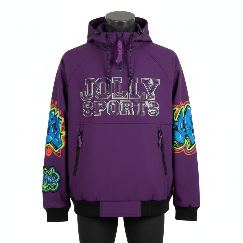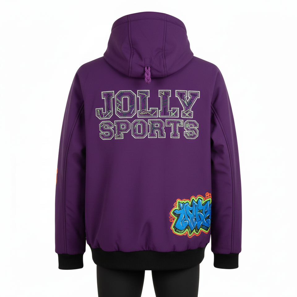Chaqueta softshell premium para hombre en morado intenso con paneles de manga con arte de grafiti y bordado de logotipo personalizado completo, estilo casual.