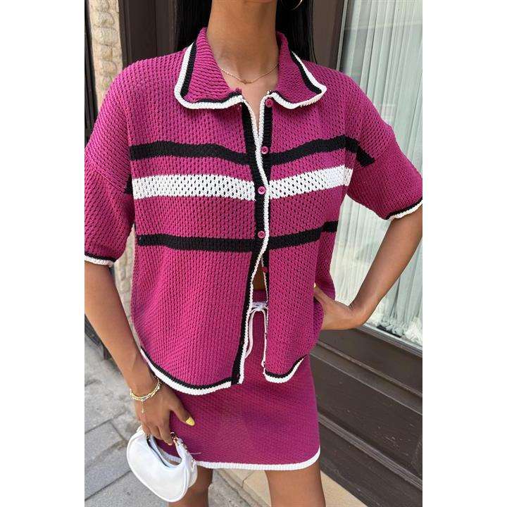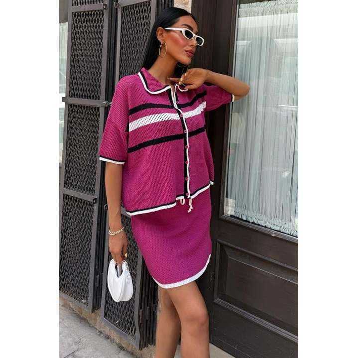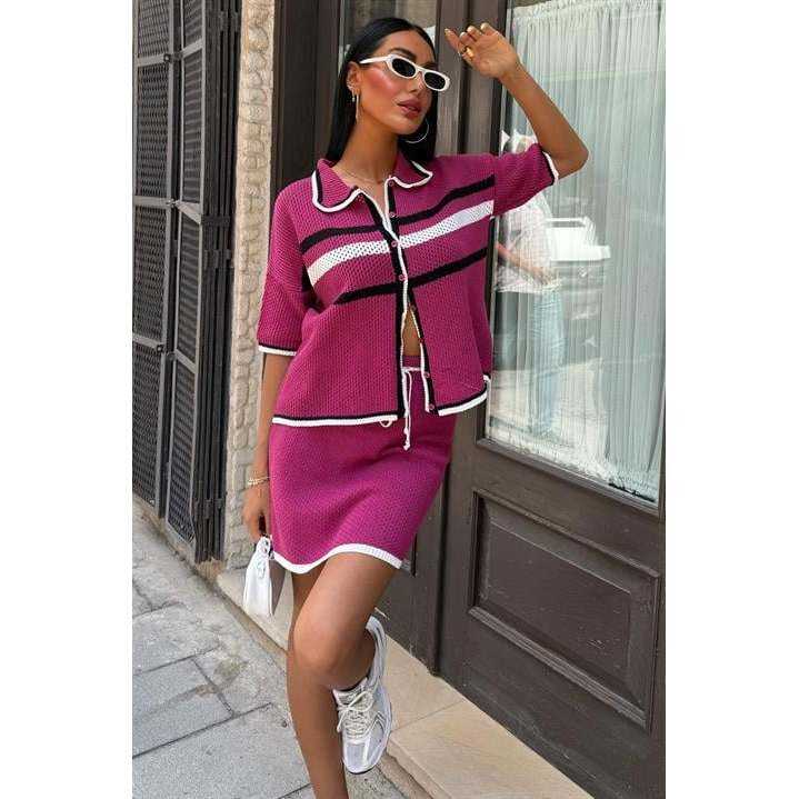 Conjunto de Punto Estilo Preppy 10102 con Cuello Camisero y Falda
