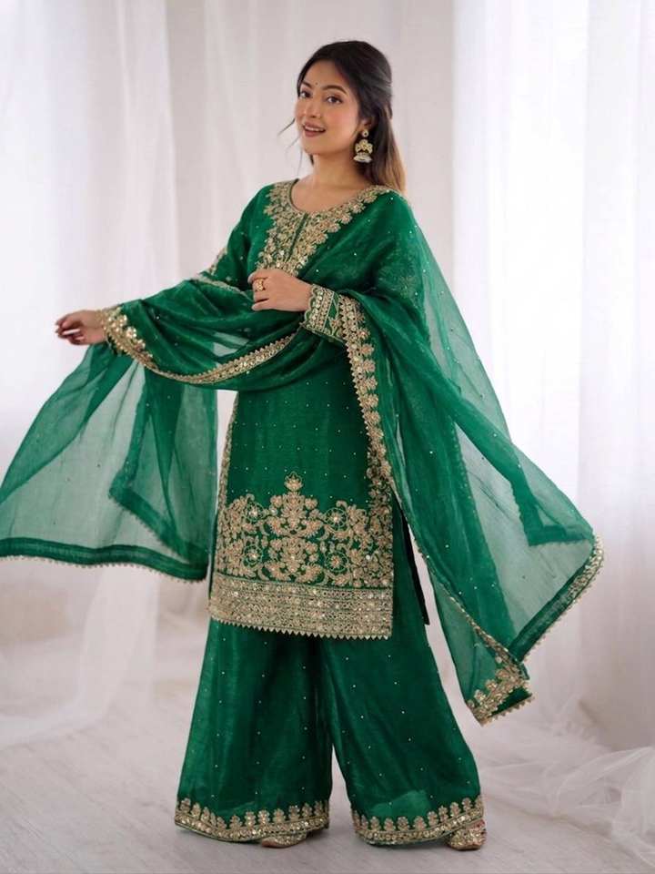 Presentamos la nueva colección de conjuntos de seda con bordados elaborados y detalles de lentejuelas, que incluyen top, pantalón y dupatta, completamente cosidos y listos para usar.