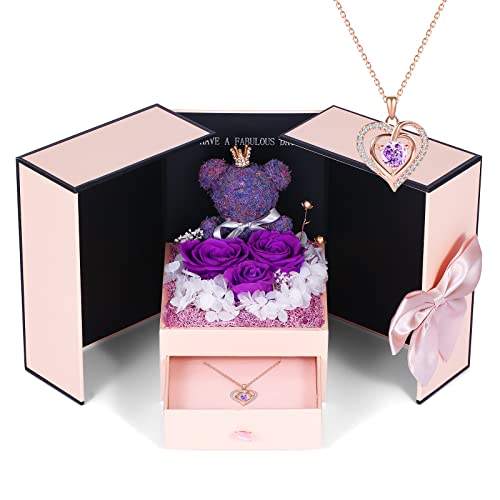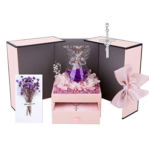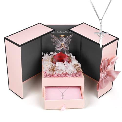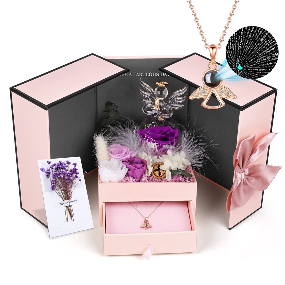 Set de Rosa Preservada con Ángel Religioso, Incluye Collar de Plata de Ley 925 con la Frase 'Te Amo' en 100 Idiomas para Mujer, Mamá, Novia