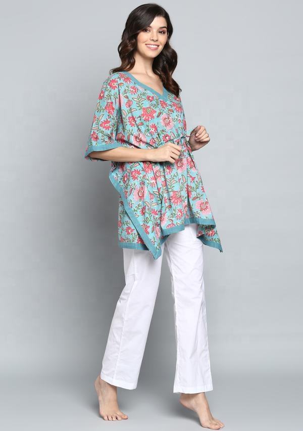 100% transpirable suave algodón atractivo turquesa mano bloque impreso Rosa Floral corto Kaftan con pijama blanco