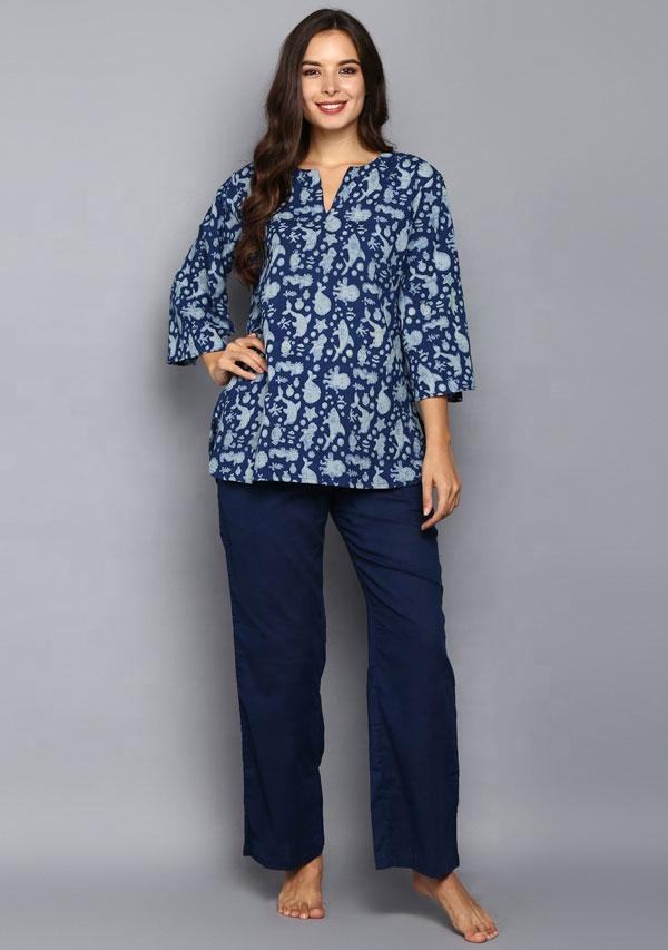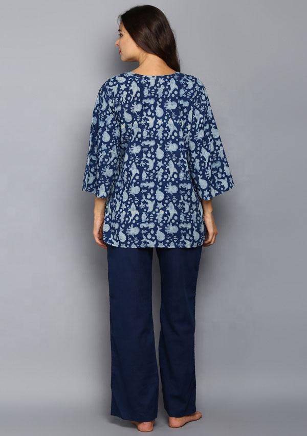 Pretty Indigo Ivory Hand Block Impreso Animal acuático Top y pijama sólido Telas tejidas de algodón natural elaboradas con cuidado