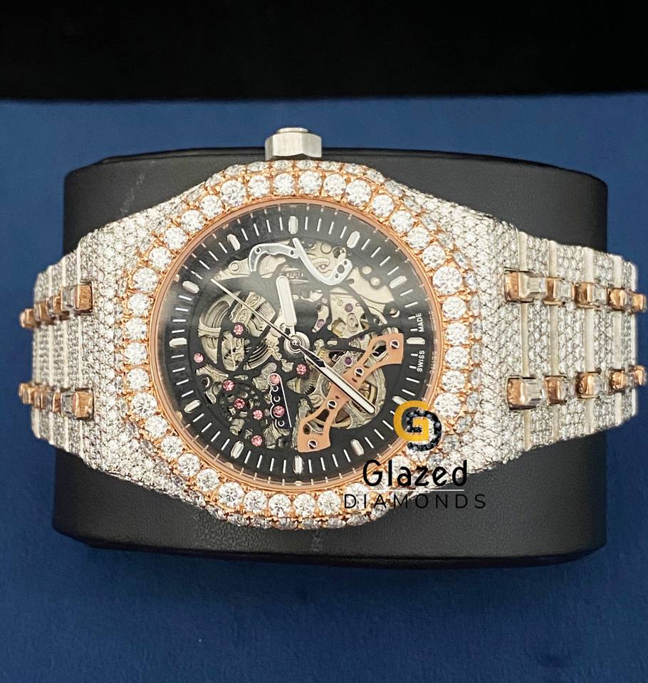 Bonito reloj de esqueleto de dos tonos Moissanite hecho con diamantes de corte brillante redondo claridad VVs mejorada
