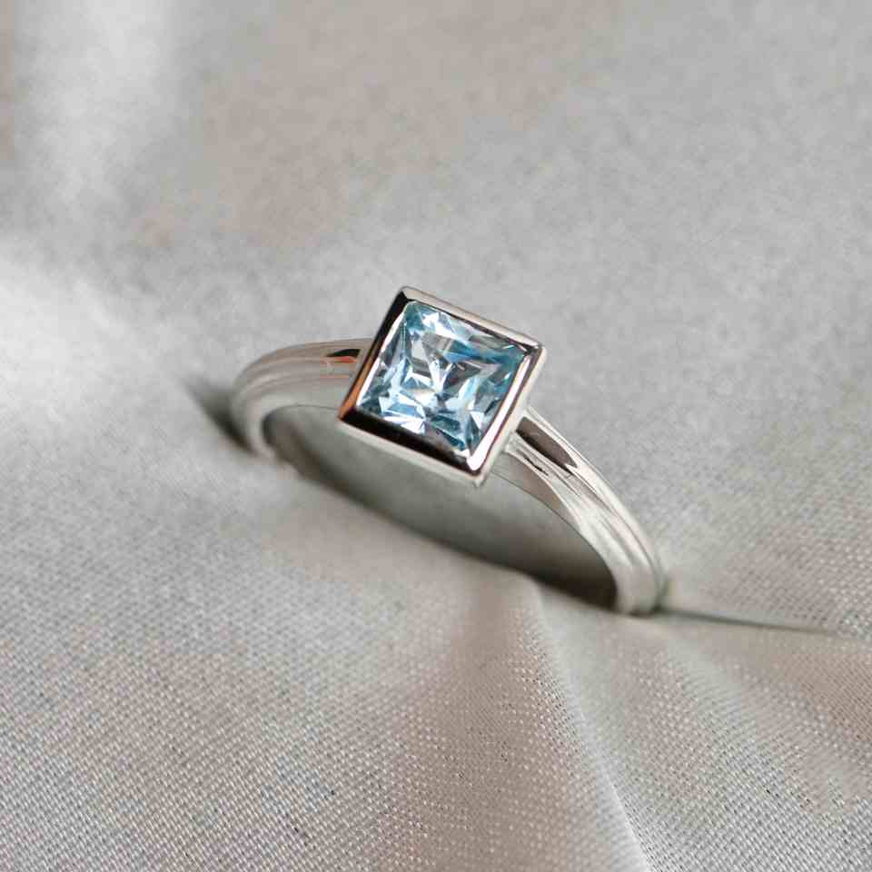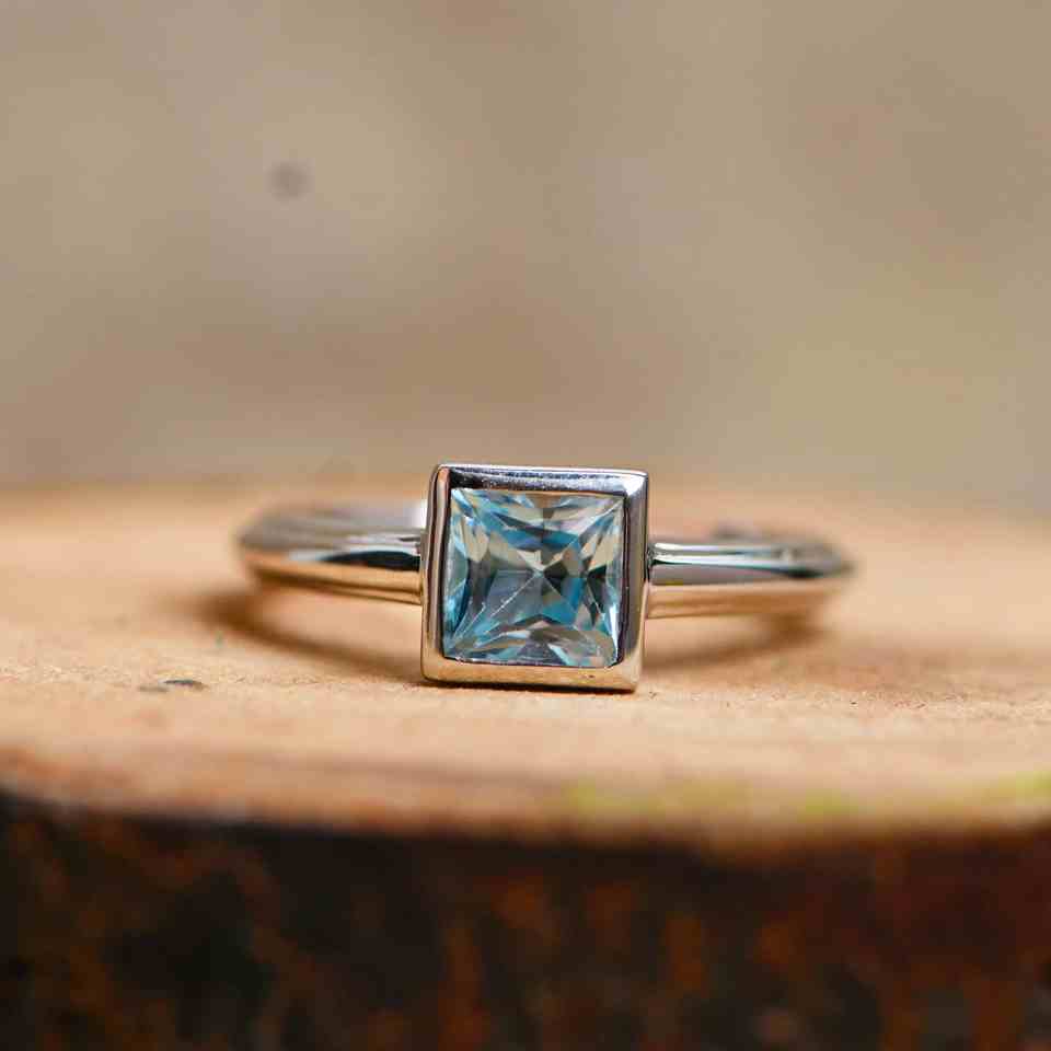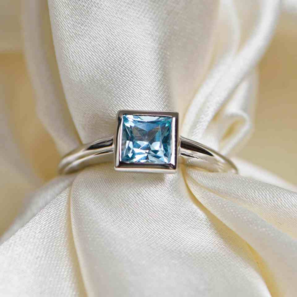 Anillo de compromiso de lujo para mujer con topacio azul talla princesa y engaste de bisel en plata de ley 925, ideal para ocasiones festivas