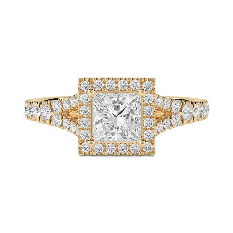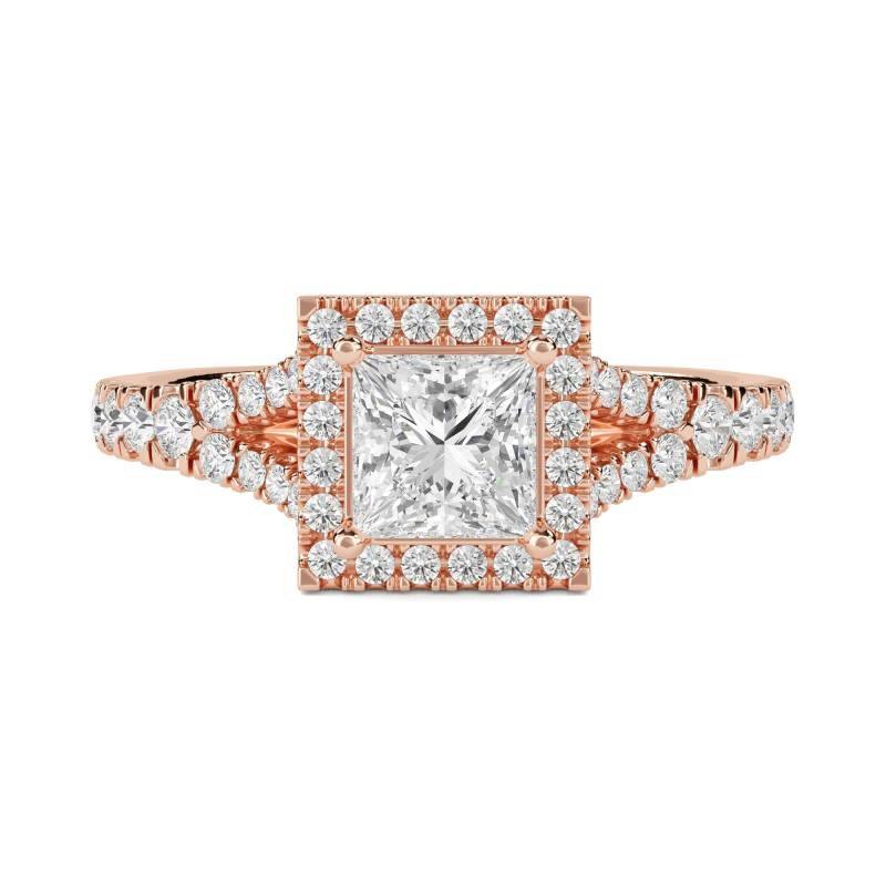 Anillo de un solo halo con corte princesa y diamante cultivado en laboratorio de 0.85 ct en oro amarillo, blanco, rosa y platino de 18 quilates