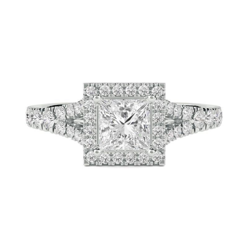 Diseño: Anillo de hombro con halo único de diamante princesa