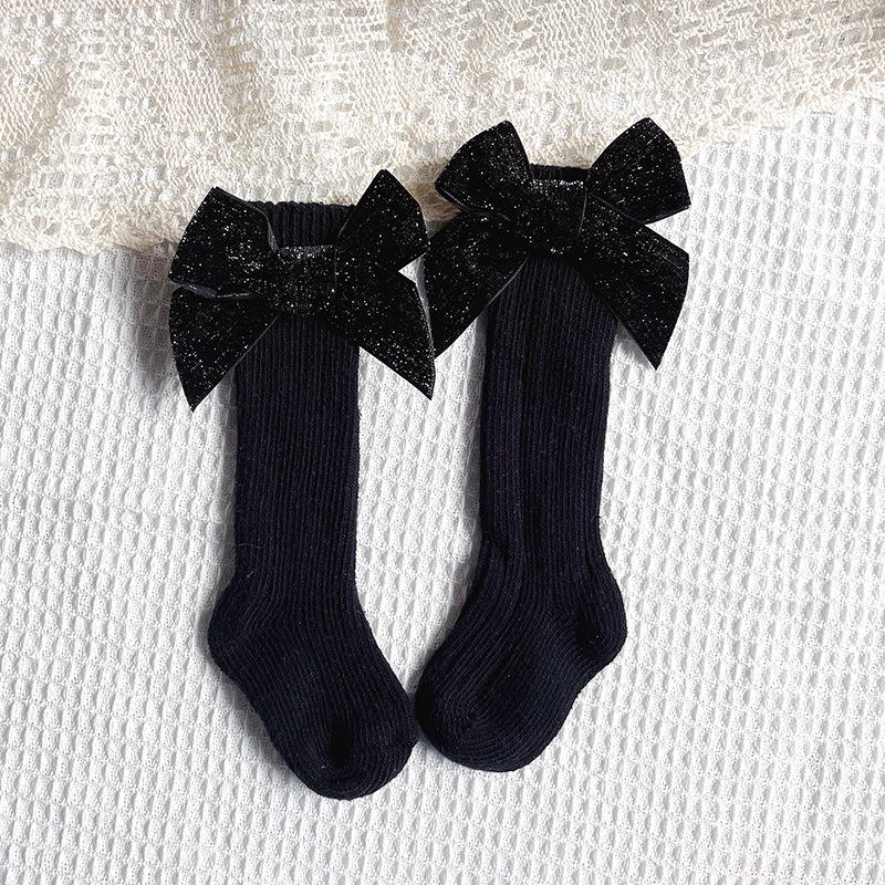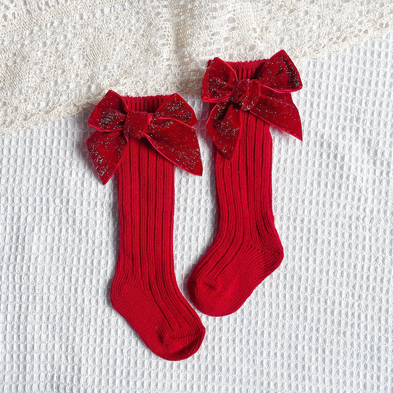 Princesa calcetín largo hasta la rodilla estilo español al por mayor rojo verde brillo bebé niñas terciopelo arco calcetines de lana