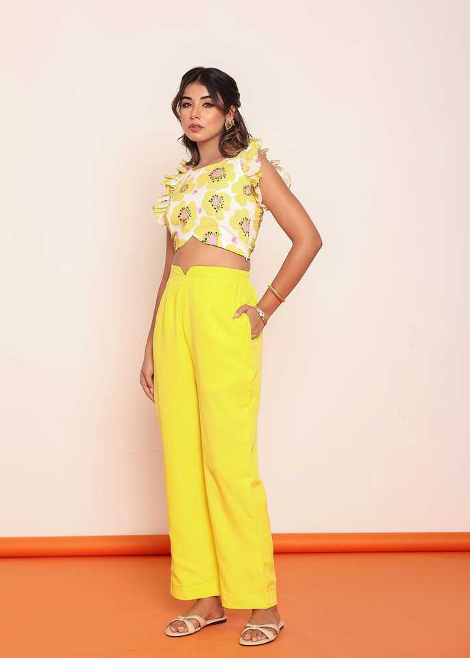 Conjunto de Dos Piezas para Mujer: Top Estampado con Volantes y Pantalón con Corte Especial, Diseño Elegante, Estilo Moderno y Cómodo