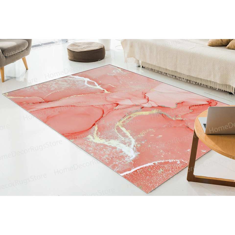 Alfombra Estampada - Diseño de Mármol Coral y Dorado para Decoración de Hogar de Lujo, Alfombra de Terciopelo de Lujo