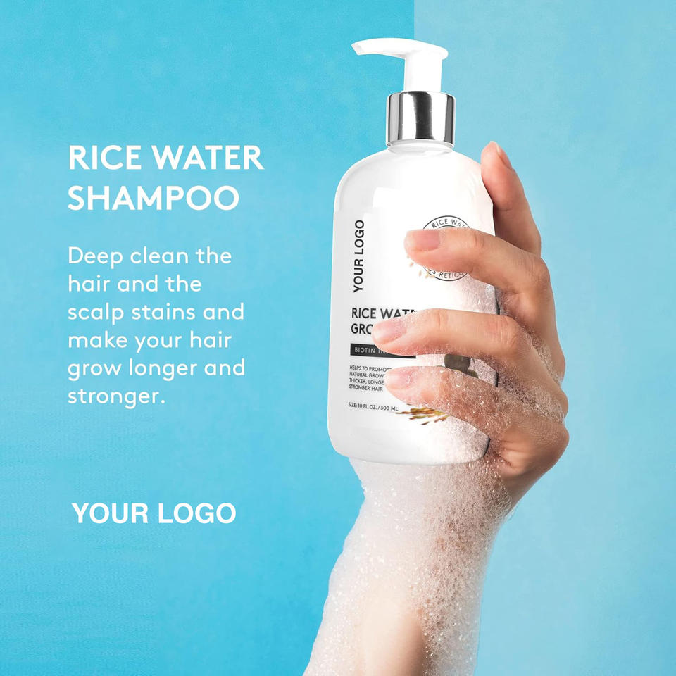 Champú de agua de arroz rico en biotina de etiqueta privada fórmula espesante Natural para el crecimiento del cabello suavizante pérdida de cabello