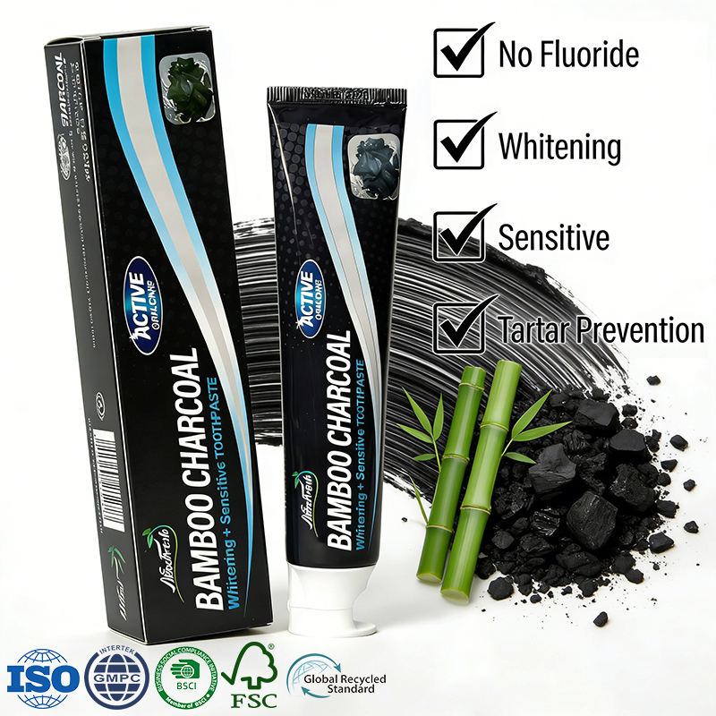 Fabricante OEM al por mayor de pasta dental personalizada sin flúor y con carbón de bambú, para el blanqueamiento de dientes sen