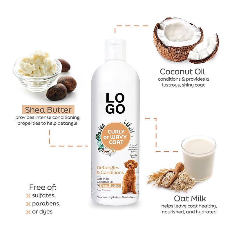 Champús para perros de etiqueta privada Desenreda y condiciones con leche de avena Aceite de coco y manteca de karité Champú para mascotas para abrigo rizado u ondulado
