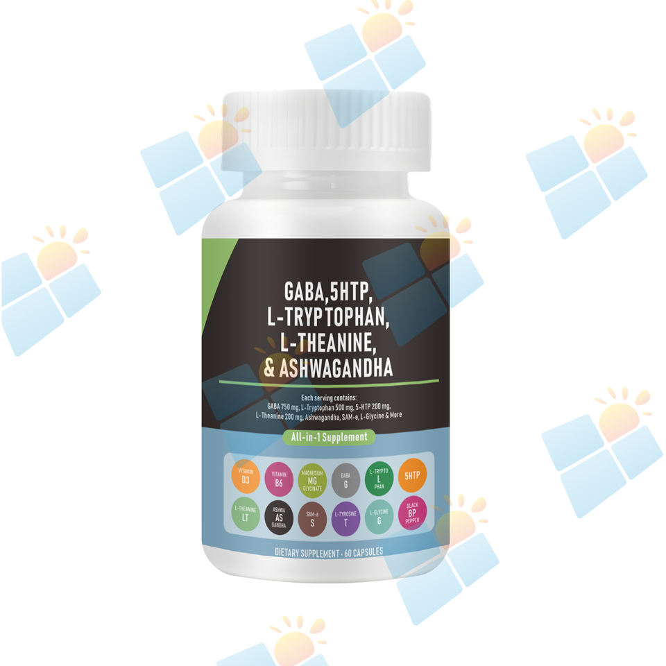 Etiqueta privada GABA + 5HTP Cápsulas L-Triptófano L-Teanina Cápsula Todo en una Solución Cápsulas de Ashwagandha