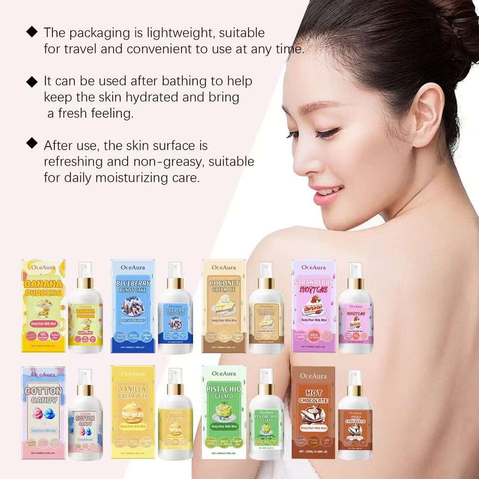Colección de fragancias de niebla de leche corporal de larga duración de etiqueta privada pastel de fresa melocotón macarrón donut de coco