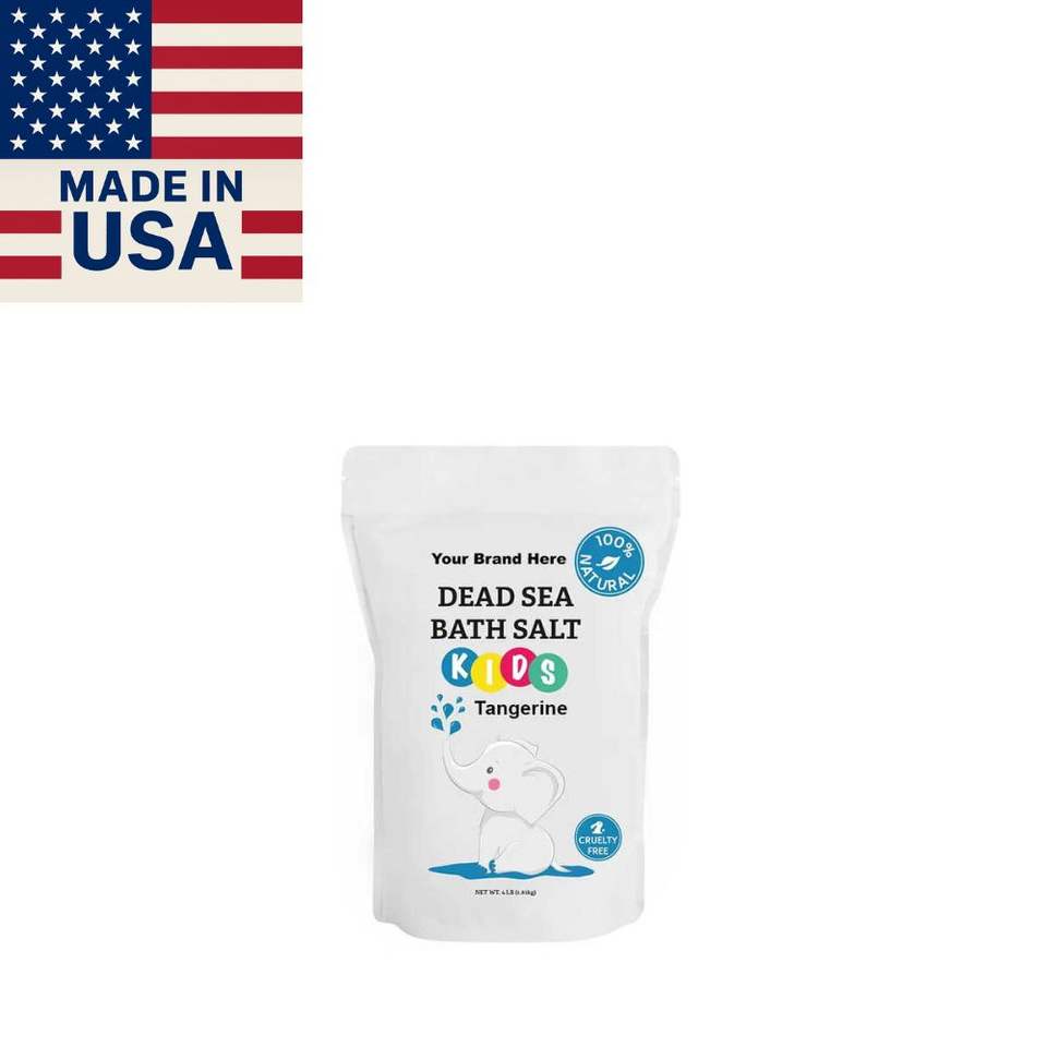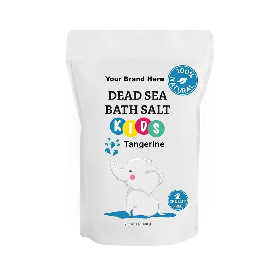 Private Label Kids Tangerine Bath Soak 4 Lbs Paquete resellable de grano fino Sal del Mar Muerto Mineral Infundido Cantidad mínima de pedido