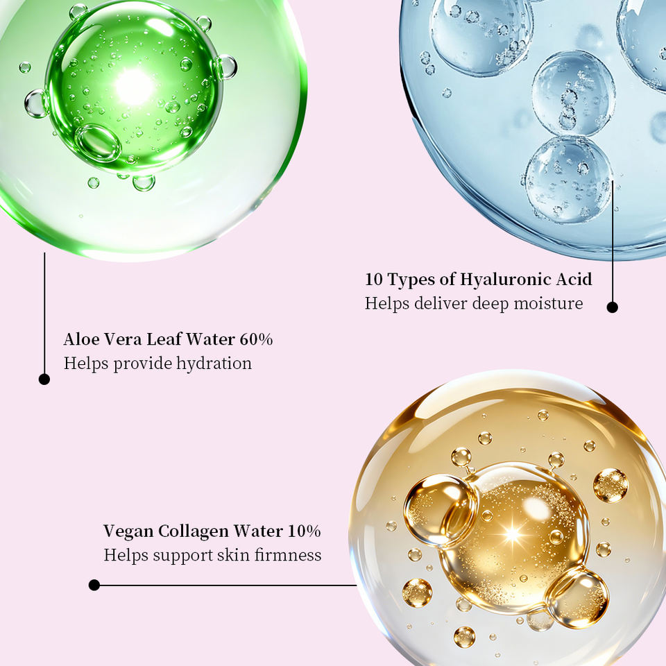 Glicerina, Aloe vera, Ácido Hialurónico, Vitamina C, Colágeno