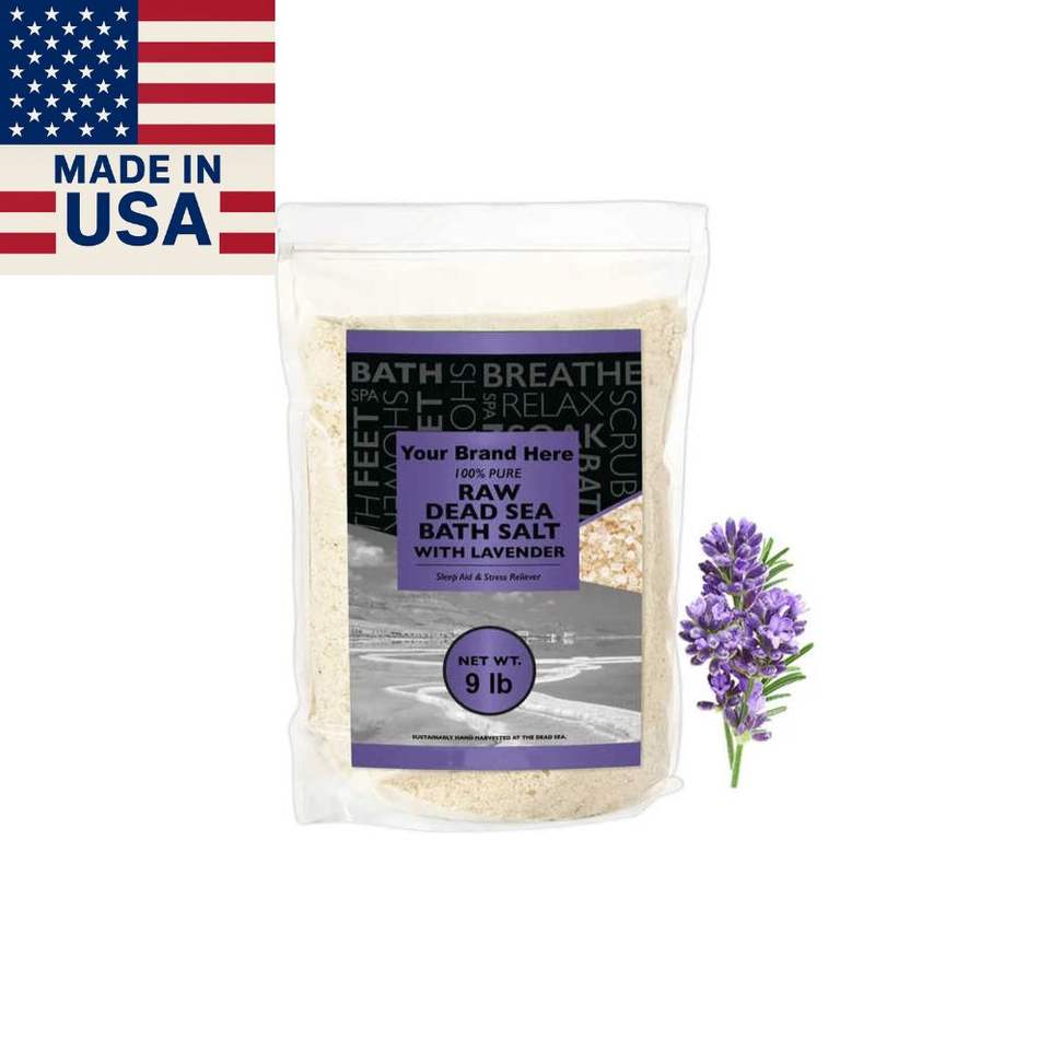 Etiqueta privada 100% Sal natural cruda del Mar Muerto Lote pequeño Nuevo 9LB Polvo de baño Lavanda No limpiado Todavía contiene todos los elementos